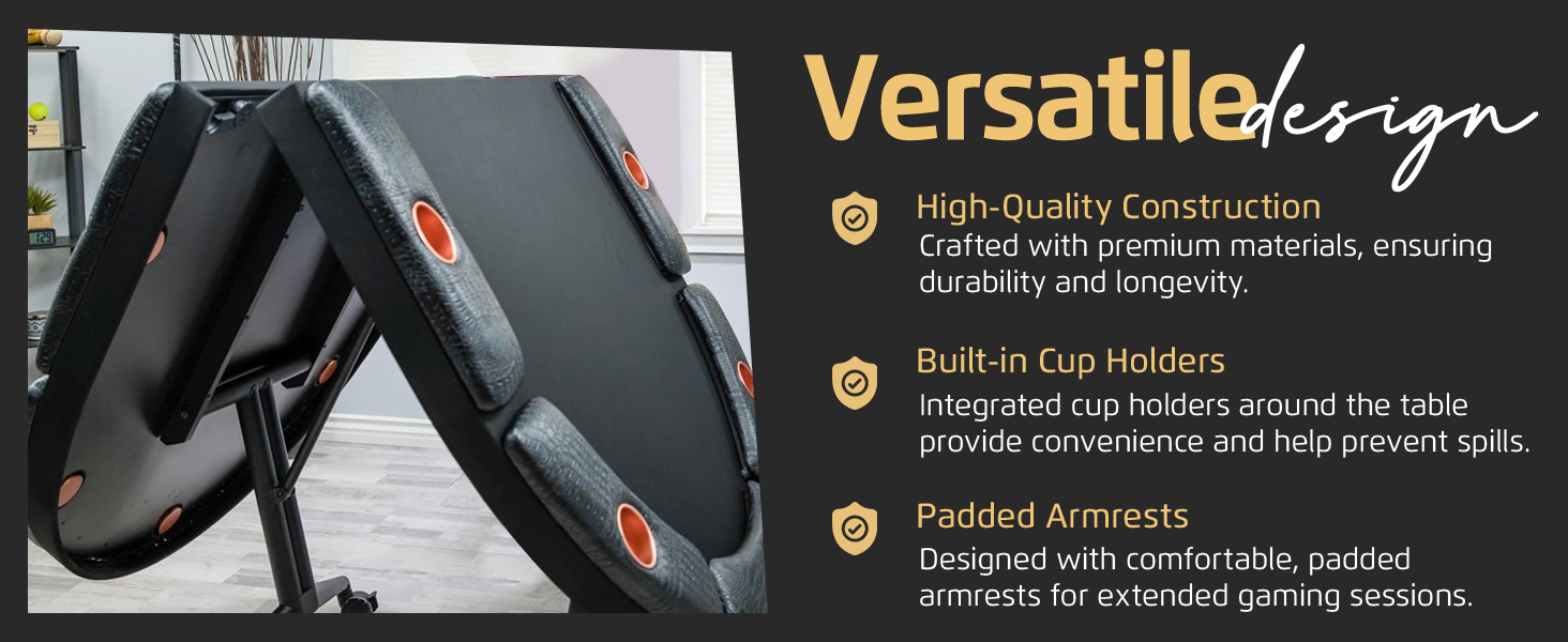 Each Triton table features a heavy-duty steel frame, padded faux-leather armrests, stainless-steel cup holders, and a premium felt surface for smooth card glide and consistent play.